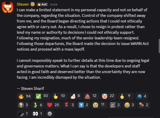 | 2 февраля В 2017 году MMORPG Ashes of Creation от Intrepid Studios привлекла почти 3,3 миллиона долларов в рамках краудфандинговой кампании. Это лучший результат по сборам для MMO и одна из самых успешных кампаний среди видеоигр. Казалось бы, проект ждёт отличное будущее, но судьба сделала неожиданный поворот, из-за чего перспективы MMO оказались туманными. Ashes of Creation публике продавали как «по-настоящему живую» MMO, в которой окружение реагирует на действия игрока, а принятые решения действительно имеют значение. Первые платные (!) альфа-тестирования начались в 2021 году, а старт в раннем доступе состоялся в декабре 2025-го. И буквально за несколько дней всё рассыпалось. В конце января сообщество Ashes of Creation начало активно обсуждать слухи об увольнениях в Intrepid Studios. В LinkedIn директор по коммуникациям Маргарет Крон (Margaret Krohn) сообщила, что её уволили, а в одном из комментариев уточнила: «Не знаю, как они будут продолжать работу, когда „сердце" проекта» — его гениальная команда — была распущена». Следом основатель Intrepid Стивен Шариф (Steven Sharif) раскрыл больше деталей. Он пояснил, что ему пришлось покинуть свою должность в качестве протеста против действий совета директоров. Таким же образом поступили и другие топ-менеджеры студии, после чего в Intrepid начались массовые сокращения.  Позволю себе лишь кратко высказаться лично, а не от лица студии. Я утратил контроль над компанией, и совет директоров стал принимать решения, противоречащие моим этическим принципам. В знак протеста я подал в отставку, отказавшись связывать своё имя или авторитет с решениями, которые я не мог этически поддержать. После моего ухода компанию покинула большая часть руководителей. Затем совет директоров, действуя в соответствии с законом о предупреждении о сокращении штата и переподготовке работников, санкционировал массовые увольнения.Стивен Шариф Более подробно рассказать о происходящем Шариф не может из-за «идущих юридических и корпоративных процедур». «Но я обязан сказать: команда разработчиков и все сотрудники работали честно и заслуживают большего, чем нынешняя неопределённость. Происходящее вызывает у меня глубочайшее сожаление», — написал основатель студии. Если верить опубликованному в экс-твиттере ролику, все сотрудники Intrepid останутся без оплаты за последний месяц из-за плачевного финансового состояния компании. Судя по постам на форумах и в соцсетях, некоторые пользователи уже давно ждали коллапса Intrepid. Мол, разработчики с самого начала выдавали посредственный контент и выкачивали деньги из геймеров как только могли, предлагая как уже упомянутые платные тестирования, так и кипу «косметики», которой якобы больше никогда не будет. «Игра всегда ощущалась „скамом". Рад, что не потратил на неё ни копейки», — твитнул пользователь с ником Sato942. Кроме того, возникли вопросы к упомянутому «совету директоров» — в 2020-м Шариф утверждал, что у Ashes of Creation нет инвесторов и совета директоров. Финансированием он якобы занимается своими силами.  В итоге разозлённые игроки начали требовать возврата средств и полетели писать негативные отзывы. На момент написания заметки рейтинг проекта в Steam опустился до 45 %, а недавние обзоры вообще опустились в красную зону «в основном отрицательных ревью» — позитивных отзывов всего 31 %. Пользователи призывают друг друга не покупать Ashes of Creation в связи с неопр