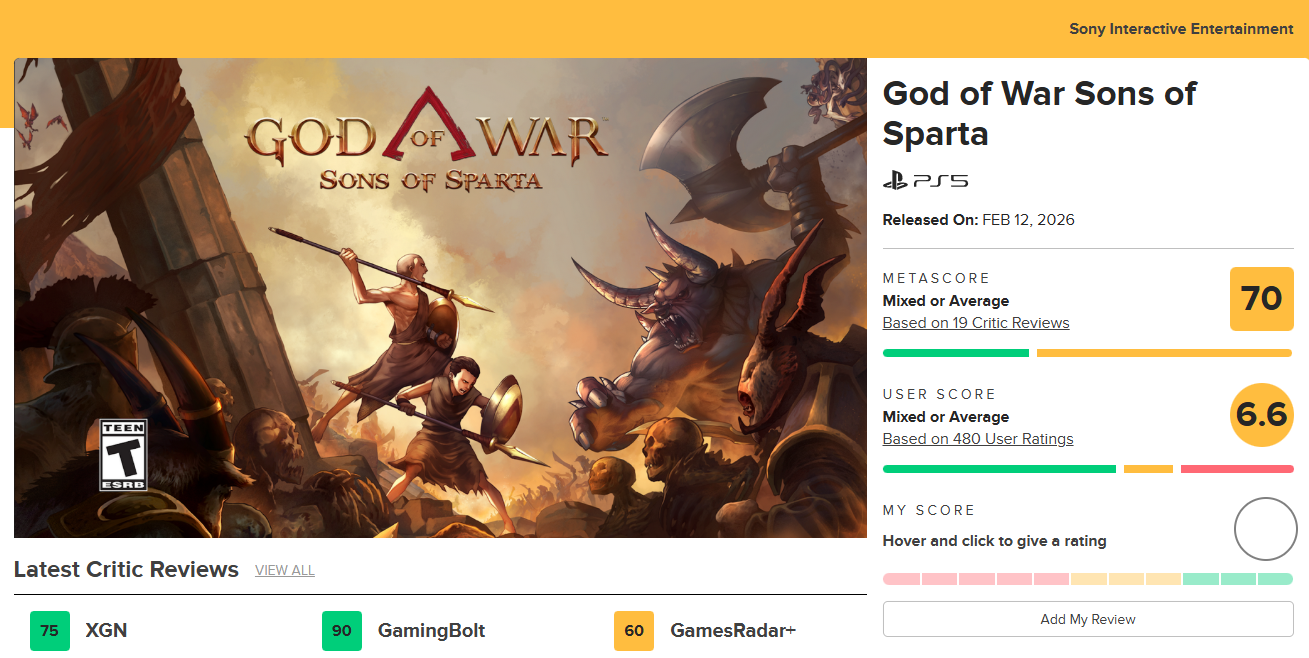 Как видно, есть ведьмак-убийца, и становится очевидно, что в следующей игре придётся развивать эту линию. Рассказать историю о ведьмаках, убивающих королей. Именно поэтому вторая часть получилась такой политизированной — в ней просто не осталось пространства для исследования личности Геральта, его семьи, его прошлого.Артур Ганшинец В рамках прохождения, которое растянулось на двадцать шесть частей, сценарист рассказал ещё много интересного о разработке первого «Ведьмака». К примеру, по изначальной задумке CD Projekt RED Геральт из Ривии не должен был выступать в качестве протагониста — на эту роль собирались поставить другого ведьмака. Снова погрузиться в историю первой The Witcher получится в готовящемся ремейке от Fool's Theory. Когда он увидит свет — пока загадка. Если верить данным инвестиционной компании Noble Securities, The Witcher Remake должна выйти только в 2028 году. Релиз отложили на год, так как команду Fool's Theory подтянули к разработке четвёртого «Ведьмака». [читать комментарии] | | 18 февраля  На днях сотрудники Santa Monica Studio и Mega Cat Studios приняли участие в презентации State of Play. В самом конце мероприятия они анонсировали и тут же выпустили двухмерный экшен God of War: Sons of Sparta. К сожалению для разработчиков, спин-офф не произвёл особого фуррора. За первую неделю с релиза тайтл получил в среднем 70 баллов из 100 от журналистов и 6.6 балла из 10 от простых геймеров на Metacritic, тем самым заработав звание самой низкооценённой части серии God of War. По большому счёту, ничего критически ужасного в игре нет. Многие попросту отмечают, что она не выделяется на фоне других метроидваний и предыдущих частей God of War. Ниже мы собрали несколько случайных рецензий с разными оценками: Sons of Sparta — фантастический экшен-платформер и глоток свежего воздуха. Тот факт, что он не такой длинный, как другие представители жанра, и проходится примерно за 10 часов, тоже играет свою роль. Разговоры Кратоса и Деймоса часто длятся слишком долго, но всё равно приятно время от времени слышать их подшучивания друг над другом. Добавьте к этому отличную боевую систему, которая достигает своего апогея в эпических сражения с боссами, и вы получите захватывающую новую главу в истории спартанцев.
